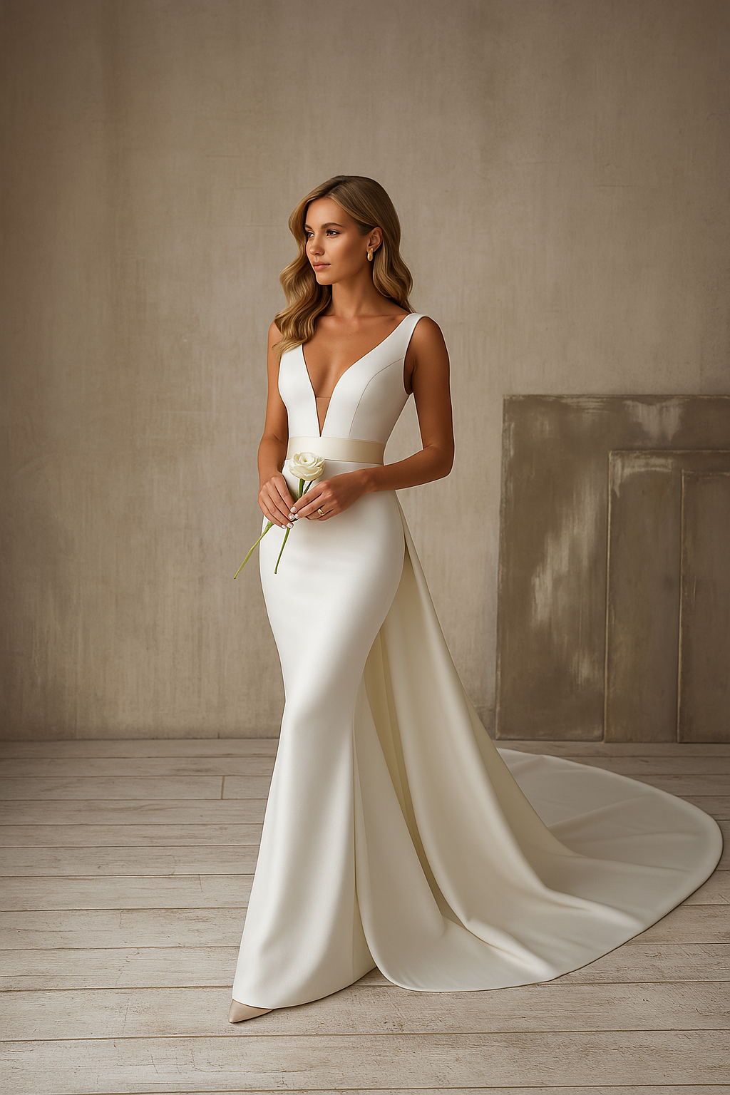 لماذا تختارين فستان الزفاف الطويل مع فتحة على شكل V بلا أكمام وذيل؟