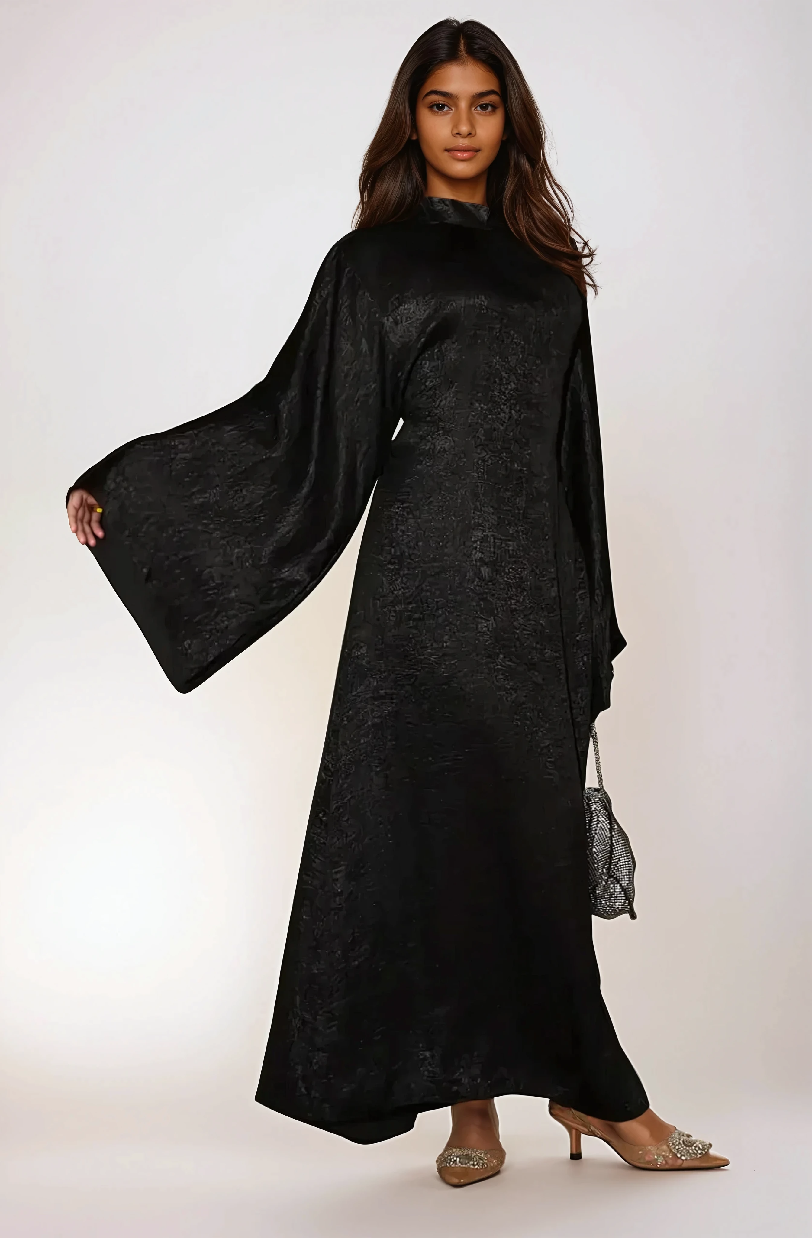 دع نفسك تنجذب إلى هذه العباءة السوداء ذات السحر الخفي والأنيق. قصتها الطويلة والسائلة تبرز جميع الأشكال، بينما تجعلها لونها الأسود الخالد قطعة رئيسية سواء للمناسبات الرسمية أو للخروج اليومي.