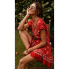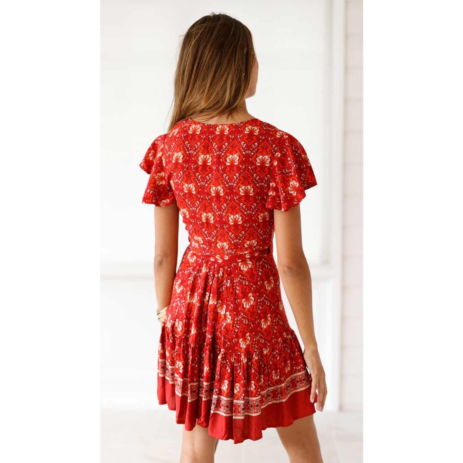 هذا الفستان الأحمر بقصة على شكل قلب يبرز القوام بفضل خط العنق على شكل V وحجمه القابل للتعديل. يضفي نقشه الزهري لمسة بوهيمية، بينما تضيف الأكمام على شكل فراشة خفة وأنوثة. مثالي للأيام المشمسة أو المناسبات الصيفية.