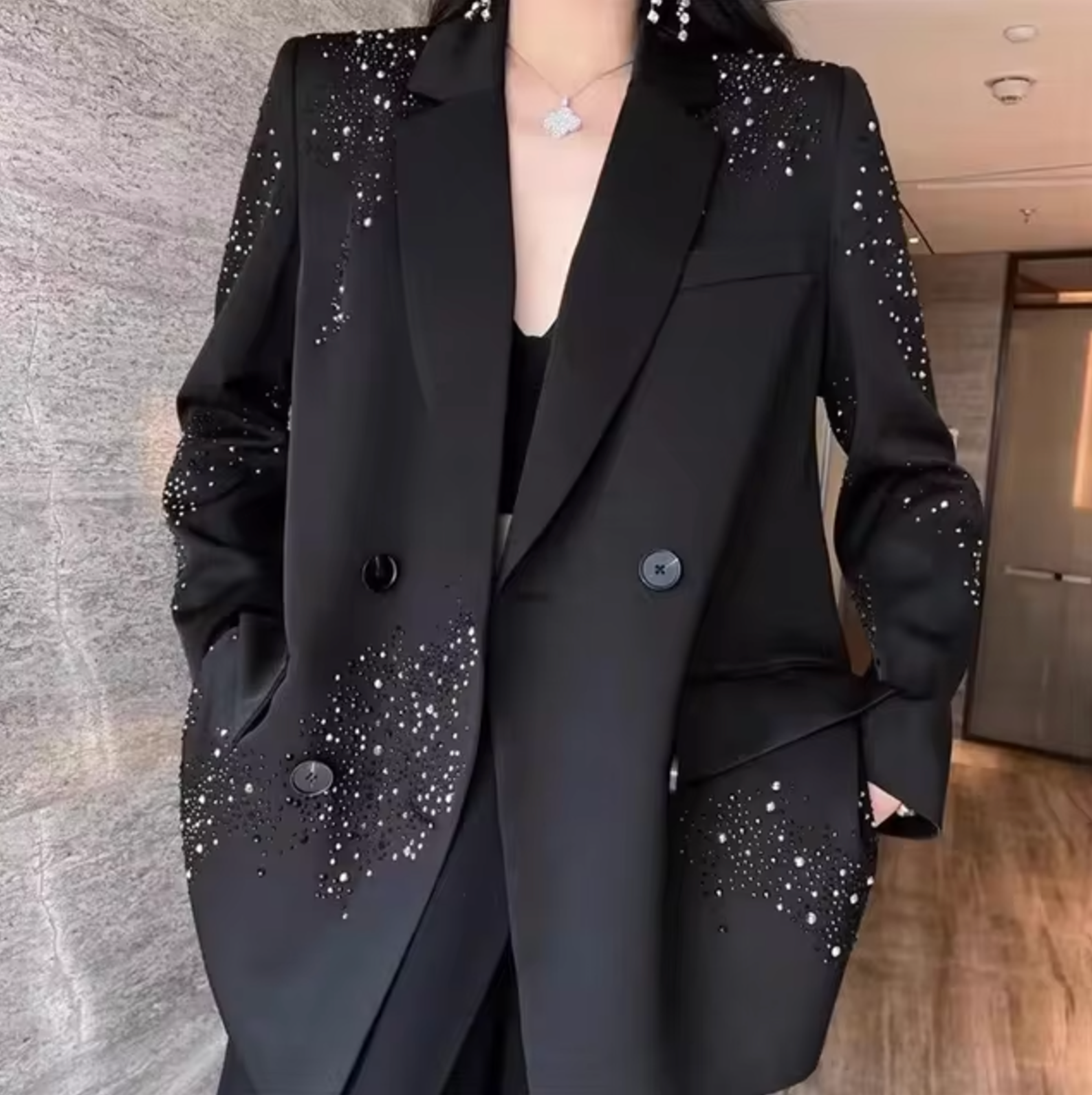 Catherine | Elegantní Černá Bunda — Subtilní Lesk & Raffinovaný Styl