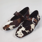 Tyto boty Mary Jane mají odvážný kravský vzor. Jsou vybaveny elegantním popruhem na přezku pro bezpečné uchycení. Ideální pro přidání jedinečného prvku do vašeho šatníku.