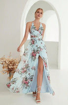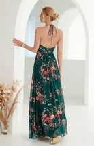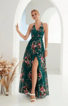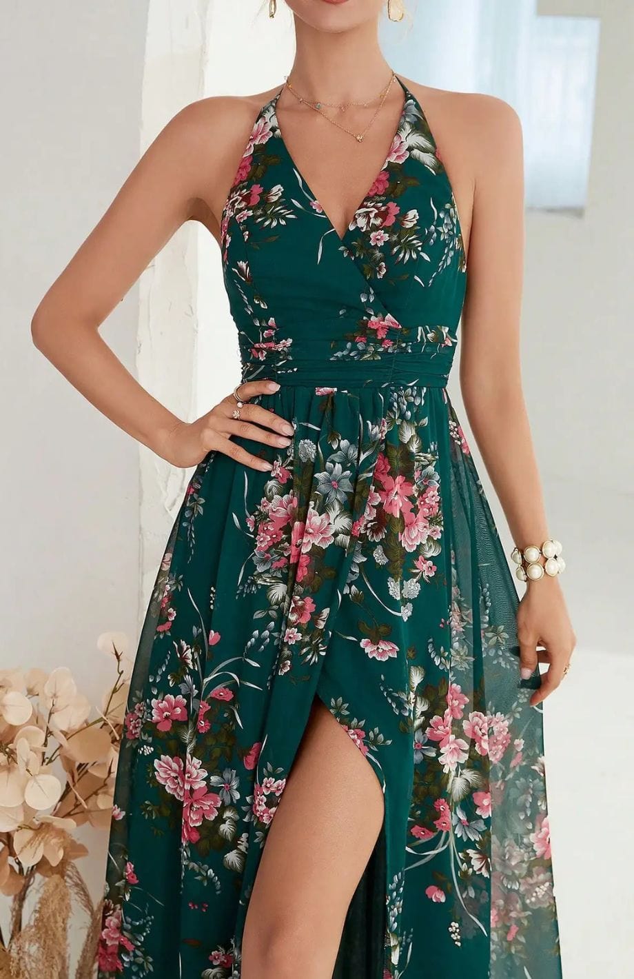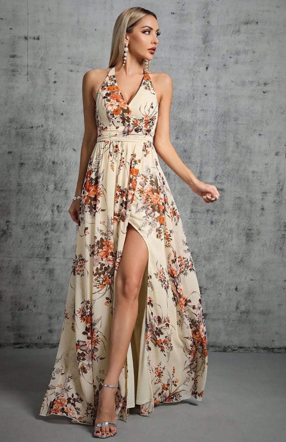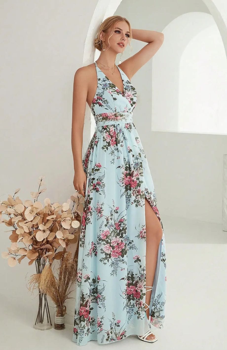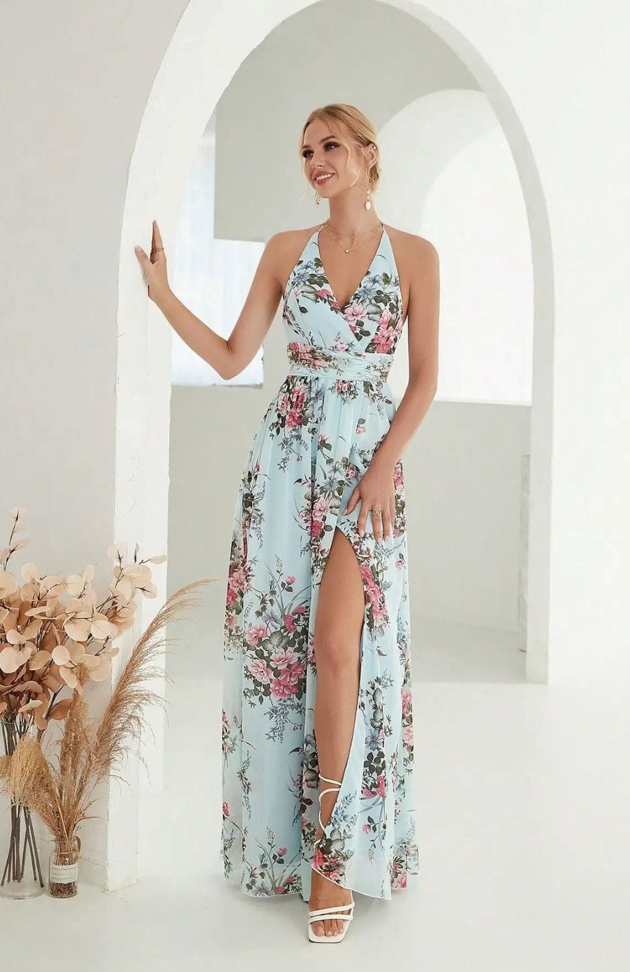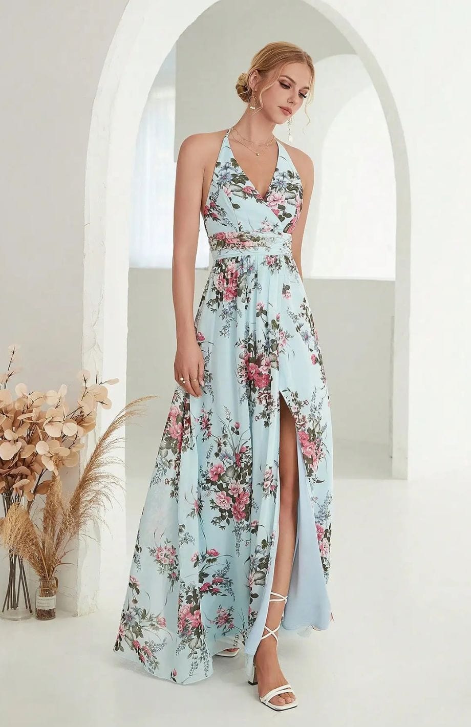 Tato dlouhá a vzdušná šaty jsou ideální pro venkovní svatby. Její výstřih do V a páskový pas zvýrazňují siluetu. Krátké volánkové rukávy dodávají lehkost.