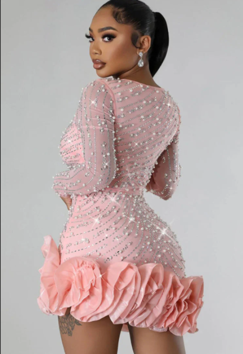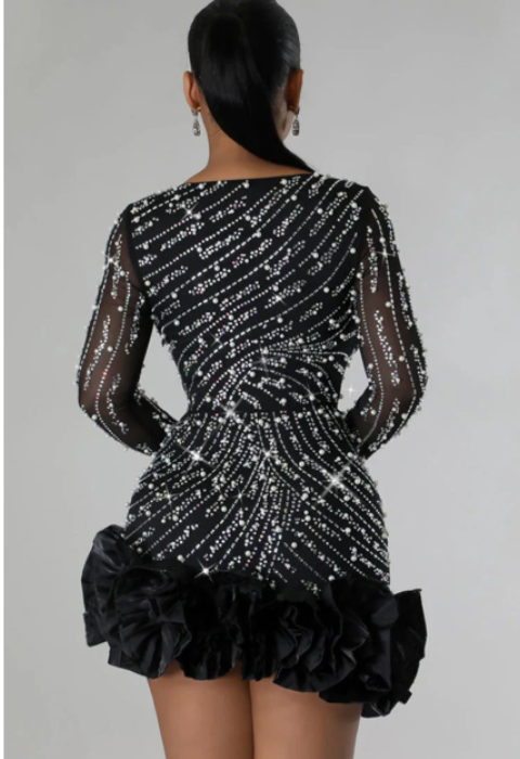 Tento mini šaty jsou zdobeny třpytivými krystaly. Její hluboký výstřih do V a dlouhé přizpůsobené rukávy nabízejí sofistikovanou siluetu. Ideální pro večery a speciální události.