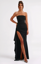 Αυτό το μακρύ φόρεμα χωρίς τιράντες αγκαλιάζει τη σιλουέτα με κομψότητα χάρη στην εφαρμοστή του γραμμή. Η εκλεπτυσμένη πλάτη και η ψηλή σχισμή αναδεικνύουν τη βάδιση προσθέτοντας μια πινελιά ελεγχόμενης θηλυκότητας. Ιδανικό για κομψές βραδιές και ειδικές περιστάσεις όπου η εμφάνιση κάνει τη διαφορά.