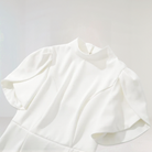 Este vestido mini presenta un corte favorecedor y mangas cortas abullonadas. El cuello alto estructurado añade un toque moderno y refinado.