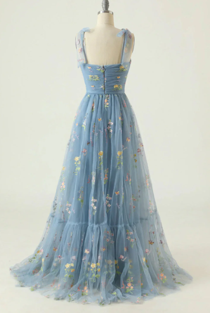 Tässä iltapuvussa on herkkä kukkakirjonta harsolla. Saatavilla lyhyenä ja pitkänä versiona, se on täydellinen erityisiin tilaisuuksiin ja kesäisiin ulkoilmatapahtumiin.