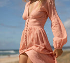Tämä pitkä V-pääntie mekko ilmentää boheemia henkeä sen virtaavalla leikkauksella ja naisellisella linjalla. Sen avara kaula-aukko korostaa hienovaraisesti siluettia, kun taas sen erilaiset sävyt mahdollistavat sen sovittamisen kaikkiin toiveisiin. Täydellinen valinta aurinkoisille päiville tai rentoille illoille.