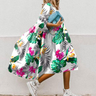 Tämä tilava kukkamekko hurmaa avaralla leikkauksellaan, joka korostaa siluettia samalla kun se tarjoaa suuren liikkumisvapauden. Sen kolme neljännesosaa puffihihat tuovat hienostuneen naisellisen vivahteen, täydellinen eleganttiin mutta helppoon tyyliin. Ihanteellinen aurinkoisille päivillesi, se sopii sekä rentoihin ulkoiluihin että hieman juhlallisempiin hetkiin.