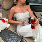 Cet ensemble élégant présente une coupe ajustée au niveau du buste et de la taille, s'évasant en un design fluide sur les jambes. Le top à tube est orné de délicates plumes, ajoutant une touche de glamour et de sophistication. Idéale pour les soirées ou les occasions spéciales, cette pièce allie modernité et silhouette intemporelle.