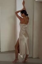 השמלה המידית עם החתך הצדדי מקסימה בעיצובה הזורם ובכתפיות הדקות שלה המדגישות את הסילואט באלגנטיות. החיתוך בצורת V מדגיש את החלק העליון של הגוף, בעוד שהחתך הצדדי מוסיף נגיעה של קלות ונשיות. אידיאלית לימים שטופי שמש או לערבים קיץ, היא משלבת נוחות וסגנון בפשטות.