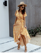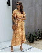 שמלות ארוכות בסגנון אלגנטי זו אידיאלית עבור חתונות כפריות או מסיבות בחיק הטבע. החיתוך המתרחב, הצווארון בצורת V והחגורה הדקה מדגישים באופן אלגנטי את הסילואטה. הדוגמאות הפרחוניות והצבע הצהוב מוסיפים נגיעה אביבית ומוארת.