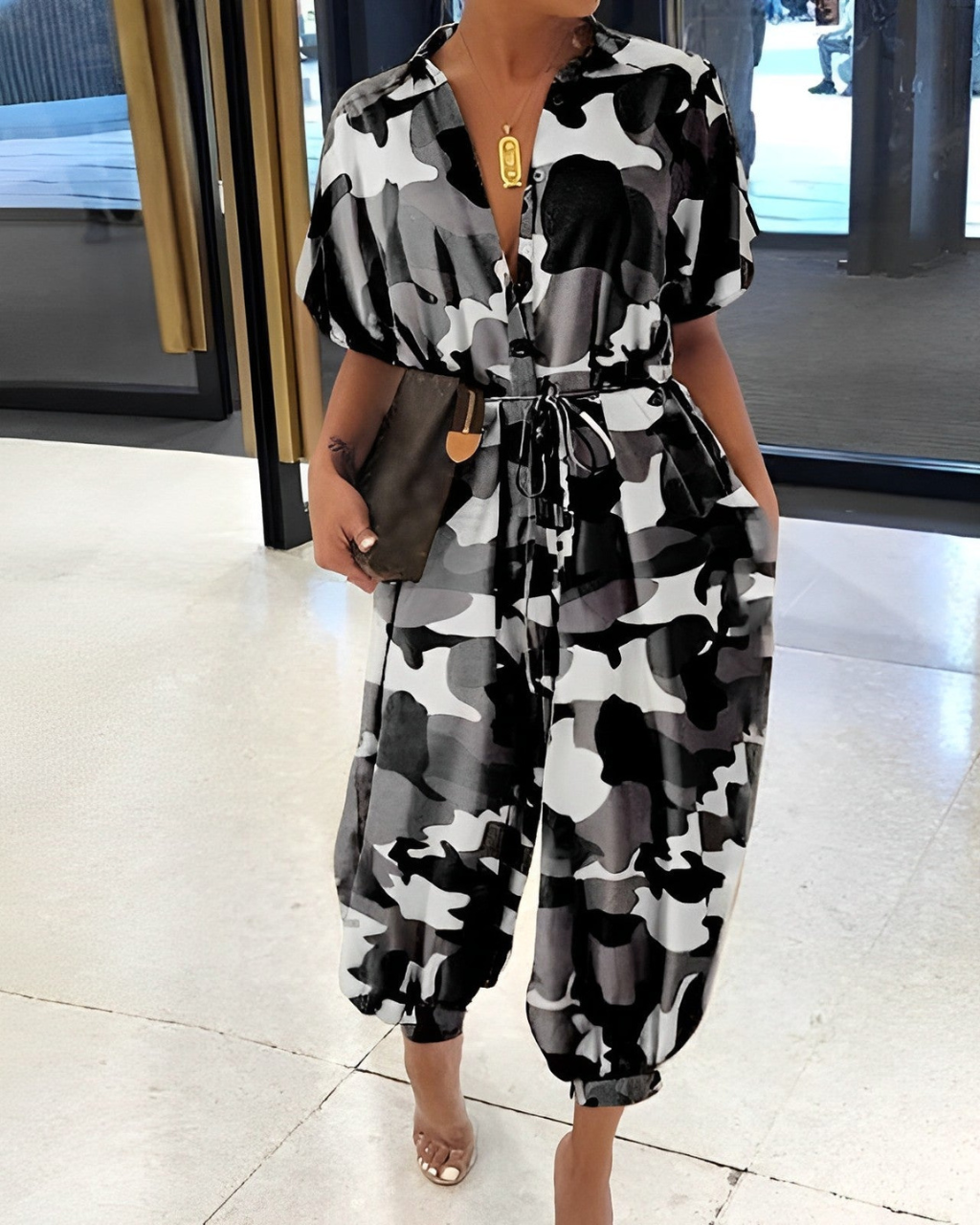 החליפה המותנית הזו מציעה סגנון מודרני וחיתוך נוח. העיצוב הכפתורי ורגליה הצמודות מוסיפים נופך אופנתי, אידיאלי ליציאות שלכם או לימים נינוחים.