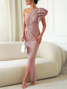 - モダンなルックのためのアシンメトリックなワンショルダーのデザイン。