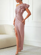 このロングドレスは、肩を露出させた流れるようなシルエットを持っています。重ねられたフリルとサイドスリットが洗練された雰囲気を加えます。結婚式、パーティー、その他のフォーマルな場面に最適です。