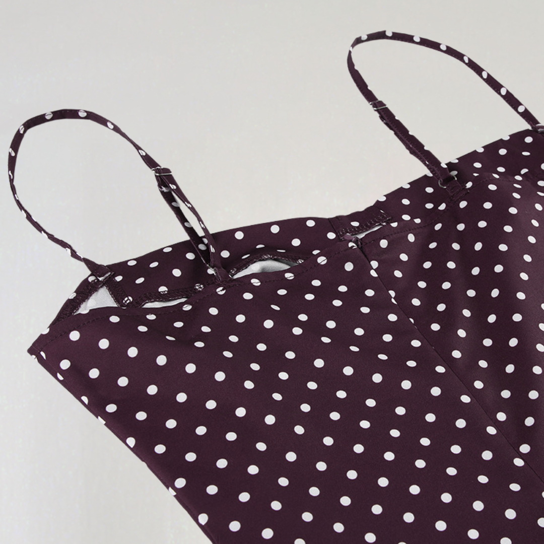 このショートドレスは、女性らしいカット、細いストラップ、ハート型のネックラインで魅了します。チョコレート色の背景にドット柄がレトロでエレガントな印象を与えます。晴れた日や夏の夜に輝くのに最適です。