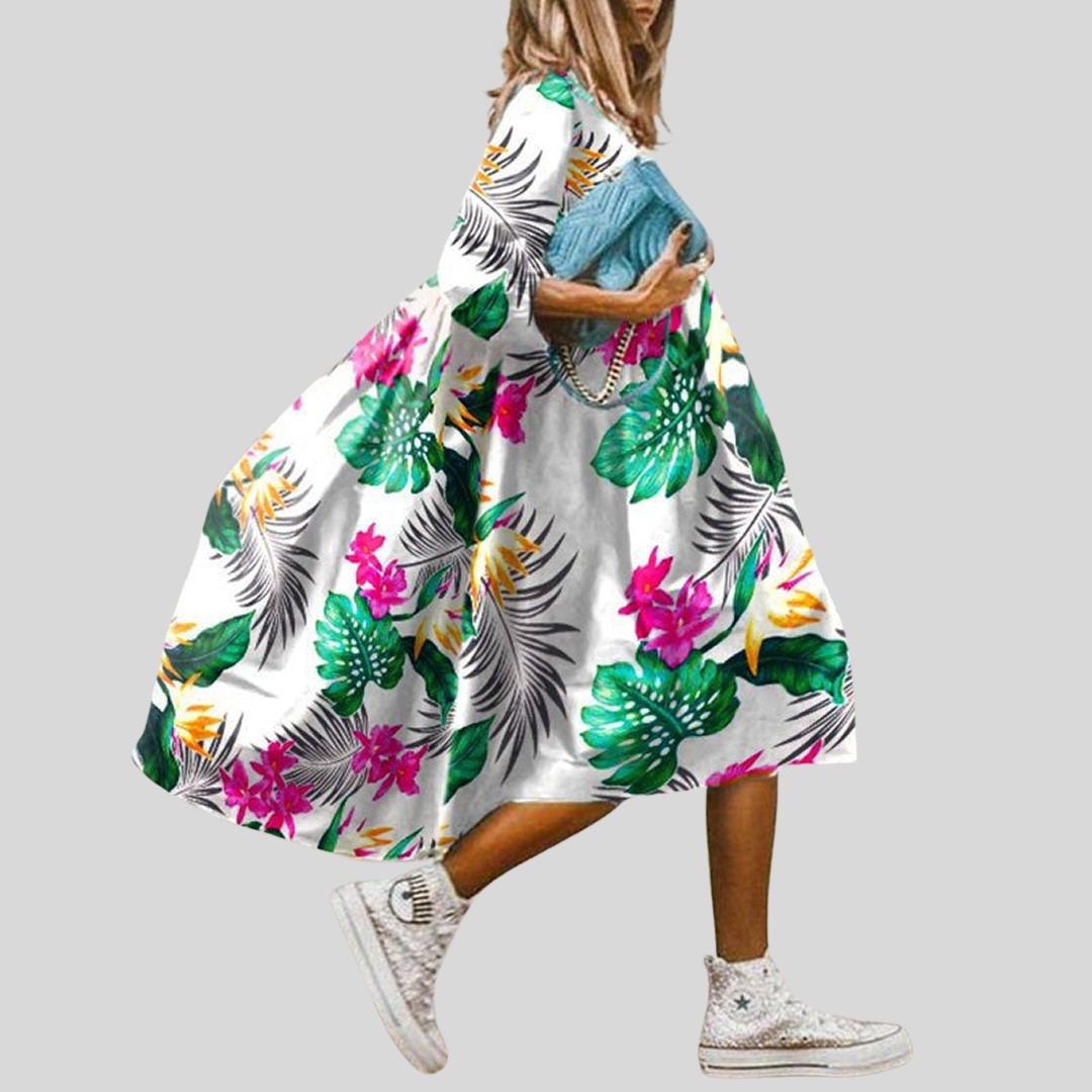 このミディドレスはボヘミアンフラワーデザインを特徴としています。複数の色とサイズで利用可能です。夏の日にぴったりです。