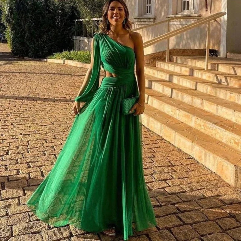 このプリーツマキシドレスは、片方の肩を露出させたアシンメトリーなカットを特徴としています。流れるようなプリーツ生地は、一歩ごとに優雅な動きを提供します。エメラルドグリーンの色合いは、洗練された自然なタッチを加えます。