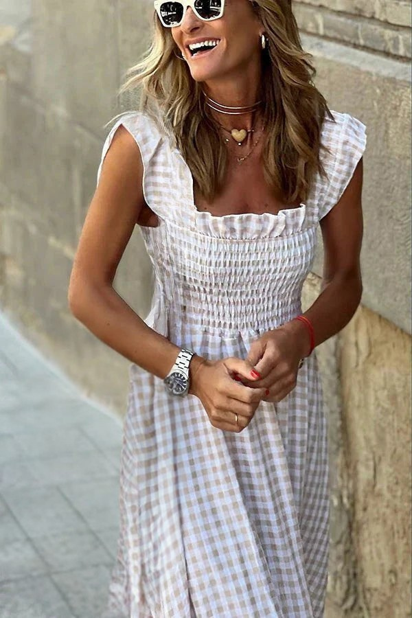 Med sitt tidløse rutemønster og elastisk midje fremhever denne kjolen silhuetten med eleganse. Den flytende snittet sikrer optimal komfort, perfekt både til hverdags og for mer formelle anledninger. En perfekt balanse mellom stil og letthet.