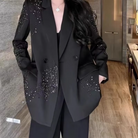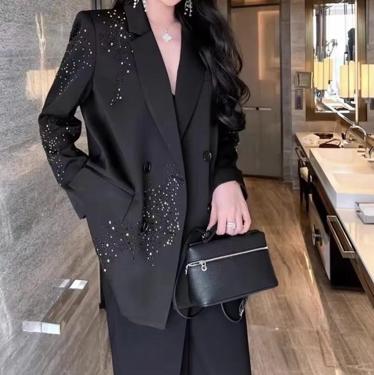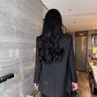 Deze zwarte jas belichaamt moderne elegantie met een vleugje delicate glans. De sprankelende details voegen een verfijnde noot toe aan uw uitstraling, zonder ooit te veel te zijn. Perfect voor een chique avond of een onderscheidende professionele look, het combineert soberheid met schittering.