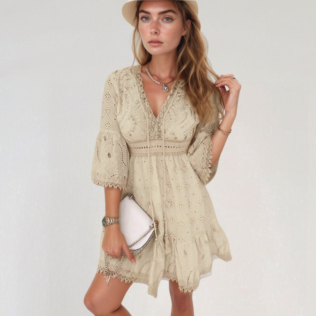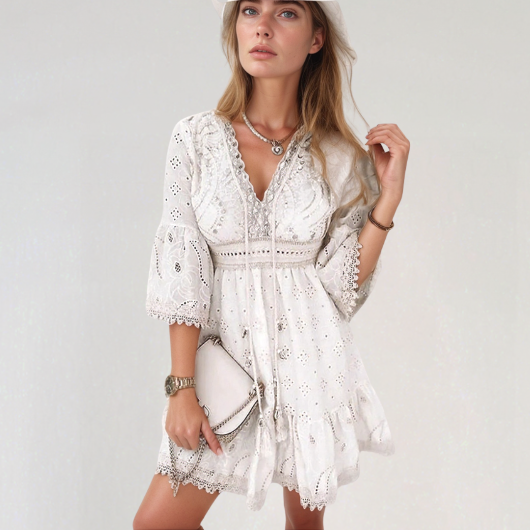 Ghislaine | Rochie Scurtă Bohème – Broderii Delicate Și Guler V