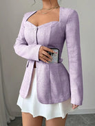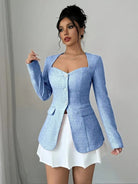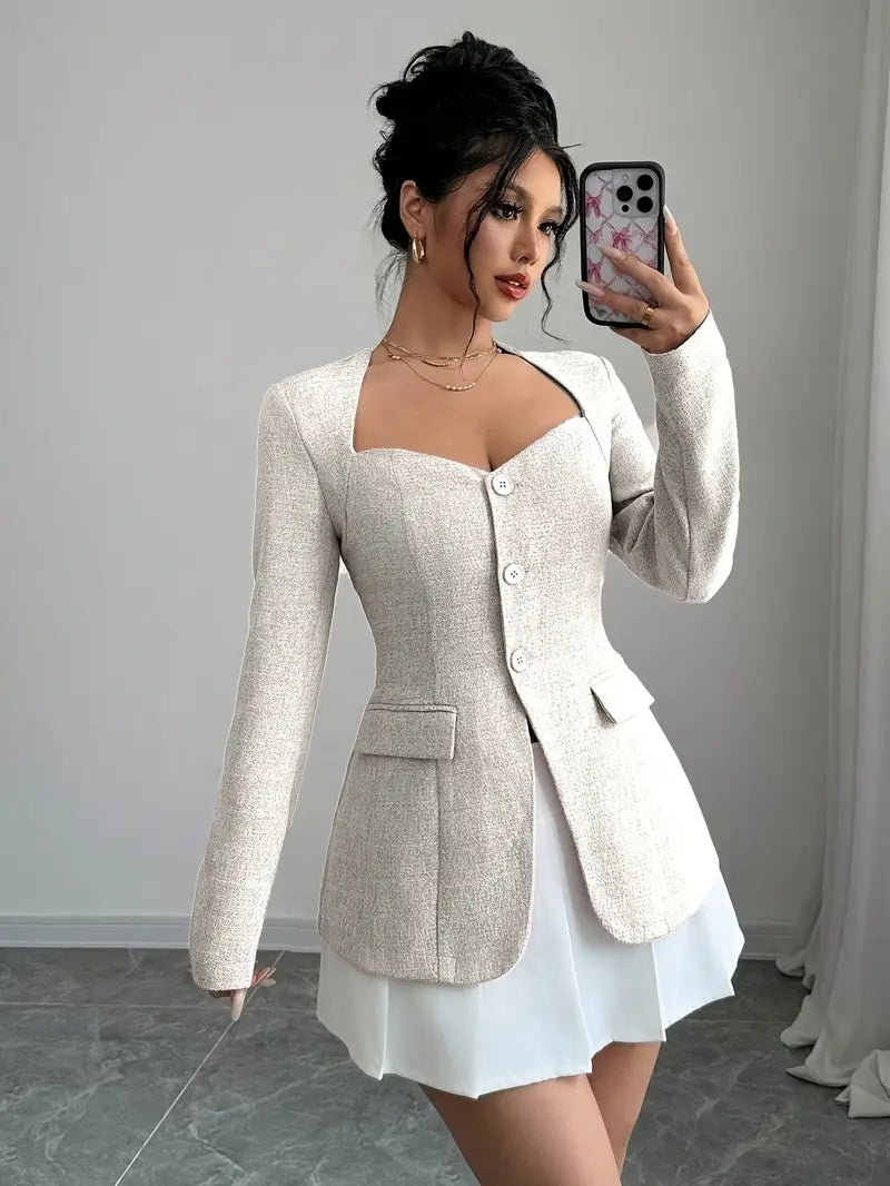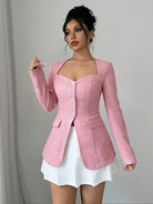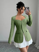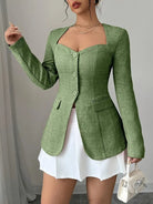 Táto zapínacia bunda zvýrazňuje siluetu svojím priliehavým strihom a moderným štvorcovým výstrihom. Ideálna pre elegantný a ženský vzhľad, nosí sa rovnako dobre v kancelárii ako aj na výlete. Jej starostlivý dizajn a jemné gombíky pridávajú vášmu outfitu nádych nadčasovej rafinovanosti.